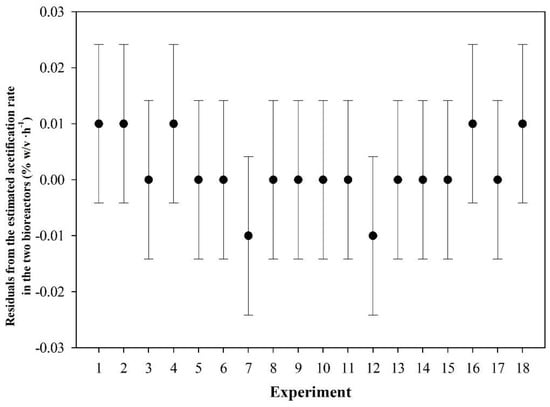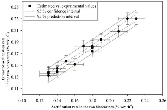 Based on the results of the ANOVA on (Table 11), there were statistically significant differences between experiments at a 99.9% confidence level. Fitting the data provided the model represented by Equation (12), which predicted the mean acetic acid concentration in the first bioreactor with an error of 0.2% (w/v). The fitting steps are detailed in Section S3.9 in file “S3.docx” in Supplementary Materials (Tables S3.89 to S3.95 show intermediate results)