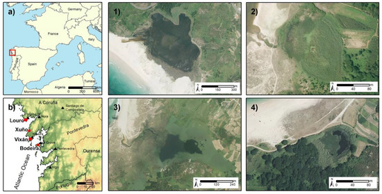 The Xuño (42°38′00″ N, 09°2′19″ W, Figure 1(a2)) and Bodeira (42°28′29″ N, 08°54′22″ W, Figure 1(b4)) lakes are both small (>3 ha) and located at the back of dune systems. In contrast to the other lakes, these lakes are located at a higher elevation (~4–5 m.a.s.l). The Bodeira lake lacks a connecting channel to the sea, while the Xuño lake the existing channel acts exclusively as an overflow channel during periods of heavy rainfall.