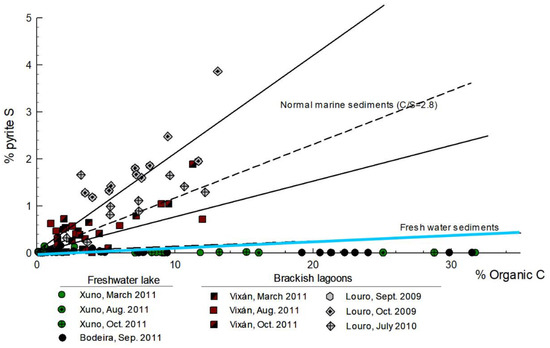 Organic carbon vs pyrite S in lake sediments. Black solid lines represent the typical relation for marine sediments (C/S = 2.8 ± 1.5; [23,36]), while the blue solid line represent the same relation for freshwater environments with a reduce sulphate concentration [22]. For each location, the graph shows the results in surficial and deep samples (up to 100–110 cm in depth). The high relation C/S in all samples indicate that Xuño and Bodeira were always freshwater lakes.