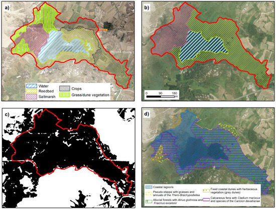 Coastal lagoon of Vixán. (a,b) represent the temporal evolution of environmental units in 1989 and 2017, respectively. On the lagoon back appear two categories, reedbed and crops, because this part is occupied for reedbeds and the local inhabitants using the zone for their crops. (c) shows TRI classification, in black, values below mean and in white the values above mean. (d) Official cartography representing the distribution of habitats from Annex I of Habitats Directive. The red line in all cases represent the extent marked for the lagoon by our analysis (IGN [20]; Xunta de Galicia ©).