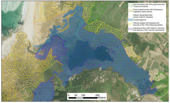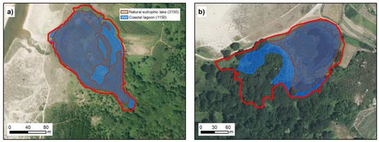 Both lakes show important similarities (regarding the water and sedimentary composition) to freshwater lakes separated from the sea (see Section 3.3). The high contents of nutrients (N and P) also indicated that the lakes are eutrophic and justify inclusion of the lakes in habitat 3150 [15]. The inclusion in a same zone of coastal lagoons and a natural eutrophic lake (Table 3 and Figure 9) is clearly an error. The characteristics of each habitat in the same water mass and their physiochemical parameters cannot be very different, as shown in Table 2. Coastal lagoon occupied a major part of these lakes (Figure 9), and although it is the main habitat, this space cannot be considered a linked natural eutrophic lake.