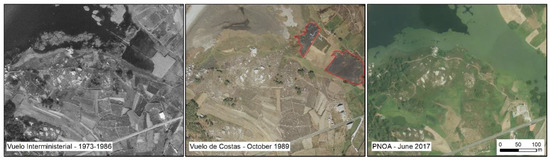 Evolution of Vixan lagoon SE sector. From left to right the images correspond with Interministerial flight (1973–1986); Coastal flight in October 1989 and PNOA image in June 2017. Data: (IGN, [20]). Red polygons in 1989 represents burnt reedbed. The burning in this lagoon part was frequent at the end of summer.