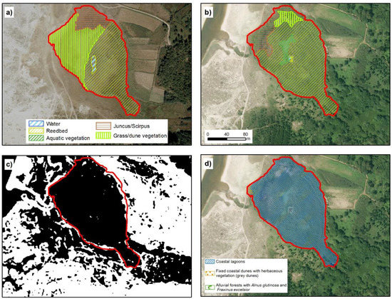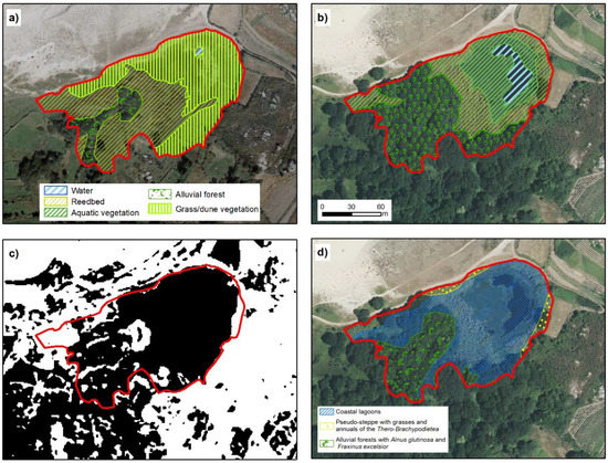 Lake of Bodeira. (a,b) represent the temporal evolution of environmental units in 1989 and 2017, respectively. (c) shows TRI classification, in black, values below mean and in white the values above mean. (d) Official cartography representing the distribution of habitats from Annex I of Habitats Directive. The red line in all cases represent the extent marked for the lagoon by our analysis (IGN, [20]; Xunta de Galicia ©).