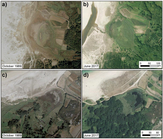 (a,b) represent the evolution of Xuño coastal lake between 1989 (a) and 2017 (b–d) show the evolution of Bodeira coastal lake between 1989 (c) and 2017 (d). Data: (IGN, [20]). An important factor to highlight in these images is the increase of alluvial forest in 2017 in relation to 1989, this habitat rises since 0.53 ha of continuous forest to 6.75 ha.