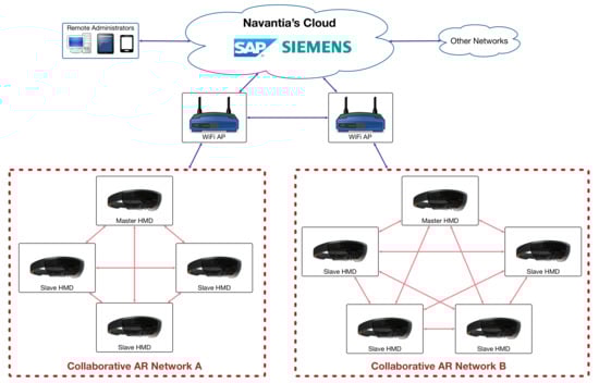 Figure 1 shows the communications architecture of the proposed system. At the bottom of the figure are two collaborative AR networks that are composed by HMD devices. Each network has a master device, which synchronizes the details of the overall AR scene, and several slave devices, which follow the indications of the Master device, but which also can communicate among them to share relevant events (e.g., an event that is triggered when a user clicks on a shared virtual object).