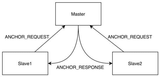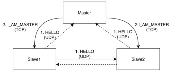 During the discovery process, the joining node sends HELLO messages as broadcasts and waits for the master’s answer. If there is a master on the network, it sends a response via TCP to the user. This process is illustrated in Figure 2, where, as an example, the interaction among three nodes during the discovery process is depicted. Solid lines represent TCP packets, and dotted lines represent UDP packets. It should be noted that all nodes receive the HELLO message, but the slaves ignore it, while the master responds to it.