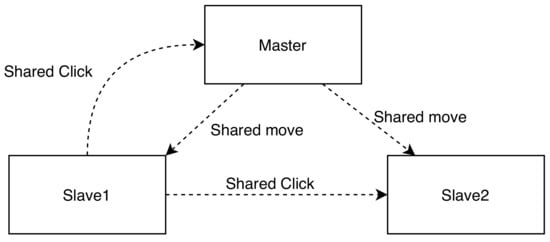 When all nodes are synchronized, they send their updates through small UDP packets as broadcast messages of about 30–50 bytes, so that all other nodes are aware of the changes in the shared experience. Figure 4 shows an example of the exchanged messages when a master node broadcasts a shared “move” message, which indicates that a 3D object has changed its position. In addition, Figure 4 also shows that Slave1 sends a broadcast with a shared click message, which indicates that the user has interacted with an element of the environment.