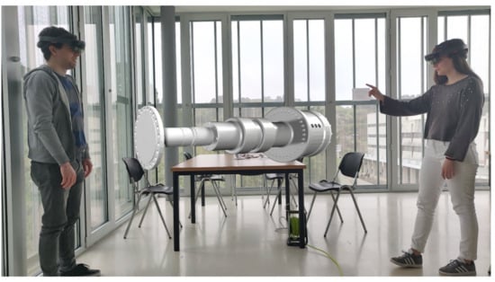 Teleassistance is also important when monitoring and repairing machines. Thus, teleassistance systems can ease remote collaboration between workers [30] and provide the same level of information that would be shared when being physically together. Such a type of augmented communication can also be used for collaborative visualization in the different engineering processes [31]. In addition, IAR systems are also able to give quick access to documentation like manuals, 3D models, or historic data [32]. Moreover, IAR is helpful when supporting decision making in real scenarios by combining the physical experience with displayed information that is extracted in real time [33].