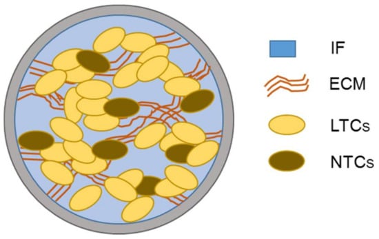 At each point of the continuum, the representative elementary volume (REV) of the multiphase computational model comprises a certain portion of ECM, TCs, and IF, as schematically shown in Figure 1. The TCs are divided in living tumor cells, LTCs, and necrotic tumor cells, NTCs. In the IF phase, transported species (nutrients) are considered. The volume fraction of the solid phase ECM is . The other phases, tumor cells (εt) and interstitial fluid (εl), occupy the rest of the volume so that the volume fractions for all phases add up to unity.