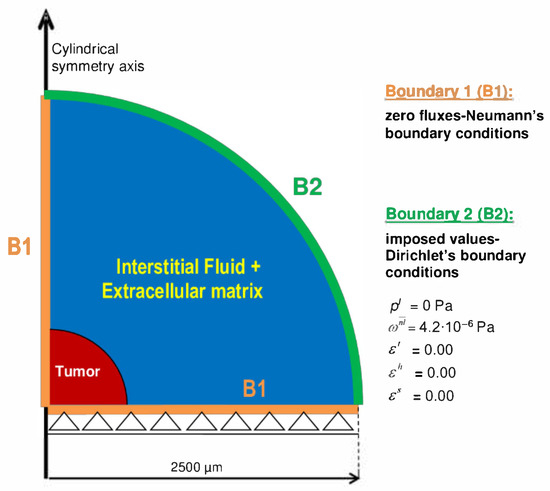 The geometry of the problems at hand is simulated with a sphere segment in axisymmetric conditions with radius of 2500 µm. At the initial time instant, the multicellular tumor spheroid (MTS) is composed of three phases: (i) the TCs phase, in the red area of Figure 2 with radius of 200 µm for the simulation of tumor growing in collagen and 250 µm for the simulation of tumor growing in hyaluronic acid; (ii) the IF phase which fills the whole domain; (iii) the ECM solid phase which also fills the whole domain. The atmospheric pressure is taken as the reference pressure and the initial IF pressure is zero Pa in the entire domain. The initial volume fraction of TCs is 0.02, the HCs are not present.