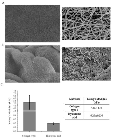 Mechanical characterization of natural hydrogels. (A,B) SEM micrographs of COL and HA, respectively, showing very distinct morphologies. Magnified images are presented on the right. COL presents a fibrous structure with a variable porosity. HA presents a complex dense structure. (C) Young’s modulus of COL and HA hydrogels. Scale bar = 5 μm and 500 nm for the low and high magnification images, respectively. Statistical analysis was determined using t-test multiple comparison with a confidence level of 95% (p < 0.05). GraphPad was used.