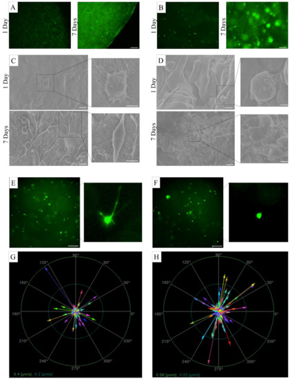 Behavior of individual glioblastoma type IV cells in hydrogels. (A,B) Fluorescent microscopy images of U87-MG GFP+ cells at days 1 and 7 post inclusion in COL and HA, respectively. Increase in fluorescent intensity indicates cell proliferation (scale bar = 100 μm). (C,D) SEM images of U87-MG cells at days 1 and 7 post inclusion in COL and HA, respectively. High magnification micrographs, on the right, document the different cell morphologies: elongated and separated in COL; rounded and clustered in HA (scale bar = 10 μm). (E,F) Fluorescent microscopy images of U87-MG cells included in COL and HA, respectively. High magnification images, on the right, confirm elongated morphologies for COL and rounded shapes for HA (scale bar = 100 μm). (G,H) Polar diagrams representing cell mobility behavior of U87-MG cells included in COL and HA, respectively.