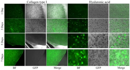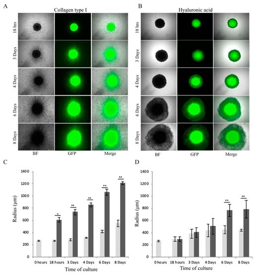 Cells of glioblastoma type IV transfected with green florescence protein—U87-MG GFP+—were included into hydrogels of COL and HA either individually or as preformed spheroids (Figure 3).