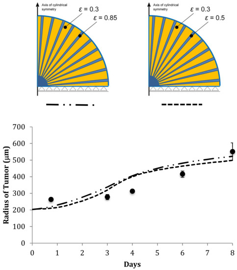Radius of the tumor against time for different ECM porosity distributions. Initially, the tumor spheroid is located within the central blue area, with ε = 0.85 (low ECM content). Externally at this central area, ECM has a nonhomogeneous porosity characterized by alternating radial sectors with ε = 0.3 and ε = 0.85 (dashed—two dots line) and ε = 0.3 and ε = 0.5 (dashed line). The two configurations provide similar results in terms of tumor growth. However, the configuration with the overall lowest porosity (ε = 0.5/0.3) predicts a slightly lower tumor growth. Dots represent the same average values of the experimental data and related error bars of Figure 10C.