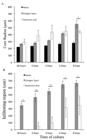 Values of U87-MG proliferation inside collagen type I and hyaluronic acid hydrogels obtained over time are expressed as a mean ± standard deviation, with n = 3 for each group of culture. Spheroid metastasis kinetic values are expressed as a mean ± standard deviation with n = 3, for each group of culture from three independent assays. Statistical significance was determined using Student’s t-test multiple comparison procedure at a confidence level of 95% ** (p < 0.005), * (p < 0.05), via GraphPad (www.Graphpad.com).