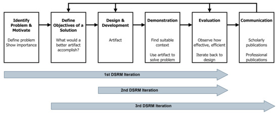 22]. Our work consists of three iterations of the DSRM process model. The first iteration incorporates the majority of this work, going from the initial entry point, to the design and development of the first version of the artifacts, as well as their evaluation. As this methodology promotes interaction with its end-users as the development goes on, the entry points of the second and third iterations of the process were only decided during the conclusion and evaluation of their previous iteration.