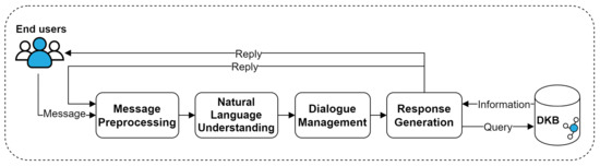 16] created a flood support chatbot system named Flood AI. This system uses a microservices-oriented architecture, in which each module acts as an autonomous service, but the system, as a whole, aims to offer stakeholders information regarding flood preparedness and response. Concerning its knowledge, it covers a month’s worth of data—14 days past and 10 days future—accessed from the Iowa Flood Information System, which includes flood inundation maps, real-time flood conditions, forecasts, and others. When the system receives a user’s question, it uses an ontology to extract useful information, such as the location, date and time, and intent. The Natural Language Understanding (NLU) module also uses a third-party spell checker, which presents potential spelling mistakes and suggestions on how to correct them. After its understanding, the question is mapped to one of the question models of the system. These models were created with pre-assigned weights and aim to provide the system with information regarding which databases to use, which analyses to apply, and the format in which the answer should be provided. Such models assure the system greater flexibility when adding support to new questions, without the need for in-depth computer science experience. Lastly, the answer can be given to the user via natural language, or through images such as graphs and maps. Even though the system is already quite complex and complete, the authors refer that the user interaction can be further enhanced, by asking clarification questions, when the system is unable to extract enough information from a user’s question.