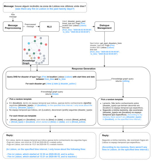 17] have proposed a water-related disaster support chatbot system named Ask Diana, which has ties with Taiwan’s Water Resource Agency. The purpose of this system is to help decision making in flood or drought scenarios, by effectively presenting decision makers with official data reports, such as weather reports, meteorograms, disaster response reports and others. As for its knowledge, the system uses a database consisting of pre-gathered and cataloged reports. To access this data, a user can both manually navigate through a menu panel, or input the system with text. This text is composed of a set of keywords that the system then matches with a static built-in mapping table, as to understand the user’s intent. Afterward, the system uses a fuzzy search method, consisting of a decision tree. The most related report is then presented to the user via images or, if there are several reports sharing the same score, the top four are shown. Although the system has displayed promising results in its usability test, the authors have reported some system limitations, such as its lack of NLP algorithms for both understanding user requests—which is done by comparing input keywords with a built-in mapping table—and presenting information. Another constraint the users have mentioned is the labor-intensive maintenance of the system, as the keyword mapping table is handcrafted and already contains up to 200 keywords, making further updates very time-consuming.