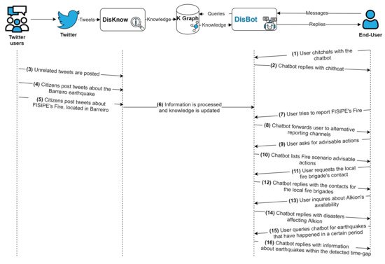 The use-case we have developed follows a citizen’s usage of the chatbot before, during and after the impact of these disasters. It also portrays the bulk arrival of tweets, which are processed and inserted in the Knowledge Graph by DisKnow [