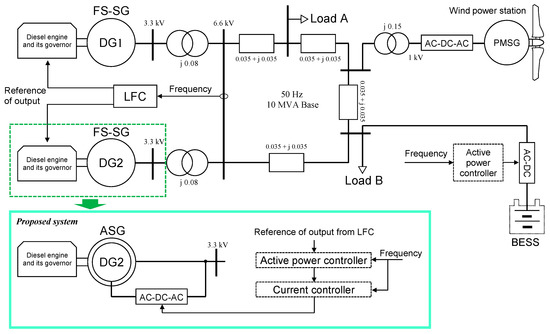In this study, it is assumed that a battery energy storage system (BESS) is installed at the connection point of Load B, as shown in Figure 1, and additional regulation by the battery charging/discharging control for the system frequency is triggered for a limited time when steep frequency fluctuation occurs so that the ASG cannot regulate sufficiently. The BESS is simulated by using an ideal voltage source without considering any power consumption or the chemical characteristics of the battery. The power of the BESS is determined according to the explanation provided in Section 4.
