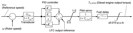 The speed governor and torque output model shown in Figure 2 is used for diesel engine-driven power plants DG1 and DG2, respectively. Several types of diesel engine and governor models have been presented; however, an uncomplicated model is adopted in this study [17,18]. The speed governor regulates the power of the diesel engine so as to keep its speed at a preset reference speed. In the case of an FS-SG generator, it is essentially controlled by a governor free mode with droop characteristics. In the case of ASG, the speed governor should control the varying speed to return it back to the preset reference more precisely; therefore, PID controller is used. The range of torque output of the diesel engine is limited, in general, between 50% and 100%, which is a typical range from the point of view of fuel cost and the lifetime of the diesel engine. Moreover, in consideration of mechanical stress reduction of the engine, the rate of change of the torque output also needs to be limited to 90%/minute, for example. Parameters of the model are expressed in Table 2, and machine parameters of the conventional FS-SG are expressed in Table 3.