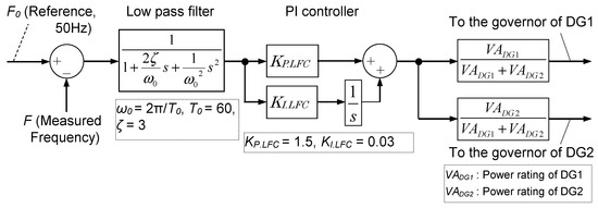 In addition to the governor free control, the outputs of DG1 and DG2 are also regulated by load frequency control (LFC), which maintains a balance between the power demand and consumption over more than several minutes. The LFC configuration is shown in Figure 3. Output commands for LFC are distributed to DG1 and DG2 in accordance with a ratio of power rating of each generator.