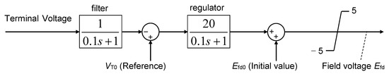 Figure 4 shows the model of automatic voltage regulator installed in FS-SG. Figure 5 shows a fundamental structure of the adjustable speed generator (ASG), which consists of a doubly-fed induction generator (DFIG) and its AC excitation control. This system has an advantage in that active and reactive power can be controlled independently. Moreover, only a partial power rating of the electronic power converter is needed, which corresponds to the maximum slip from the synchronous speed. In this study, the reactive power is regulated to maintain a constant terminal voltage of the ASG. The active power of the ASG can be utilized in response to power system frequency behavior, as explained in Section 3. The speed governor of DG2 in the case of ASG is basically the same as in Figure 2, while the reference speed is set to 1.044 pu, at which the controllable kinetic energy is halved. In this study, the adjustable speed range of the ASG is from 0.7 to 1.3 pu (thus, the power converter capacity is 30% of the ASG power rating), and controllable kinetic energy is regarded as 0% when the speed is minimum (0.7 pu) and is 100% when the speed is maximum (1.3 pu). The controllable kinetic energy becomes 50% at the speed of 1.044 pu, as expressed in Equation (1). The machine parameters of the DFIG are shown in Table 4.