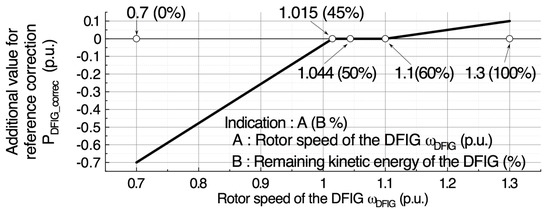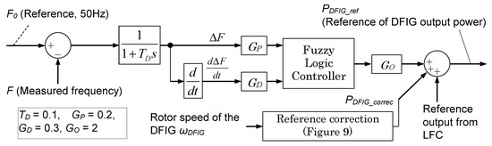When the ASG is adopted as DG2, ASG controls its output power in order to suppress the frequency fluctuations of the power system. In this study, the DFIG is adopted as the ASG, and a fuzzy logic controller is installed for generating the reference of DFIG active power, as shown in Figure 7. Due to the installation of the fuzzy logic controller, it is expected that the frequency control system can achieve sufficient performance under a variety of controlled power system conditions, such as randomly fluctuating power from the wind farm. Though there are several fuzzy logic control methods, Takagi–Sugeno fuzzy logic is adopted in this study [20]. Measured frequency deviation ΔF and its differential value are used for fuzzy logic control, and the reference for DFIG active power is calculated by using the fuzzy rule shown in Table 6 and the membership function shown in Figure 8a,b. Parameters shown in Figure 7 and Figure 8 and Table 6 have been determined by trial and error method. Specifically, the gains GP, GD and GO shown in Figure 7, and the values on the horizontal axes in the membership functions shown in Figure 8a,b have been repeatedly employed in various patterns, and the values making the system response more stable (i.e., non-oscillatory) and improving the frequency fluctuation suppression effect have been selected. Moreover, when the DFIG rotor speed approaches its limit, speed change will be restrained by correcting the reference. This process is shown in Figure 9, from which it is seen that, when the kinetic energy of the DFIG becomes less than 45%, an additional negative value for correcting the reference, PDFIG_correc, is added in order to decrease the output of the DFIG. On the other hand, when the kinetic energy of the DFIG becomes greater than 60%, a positive PDFIG_correc is added in order to increase the output of the DFIG. In this way, the threshold values and slopes are kept within the permissible range.