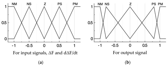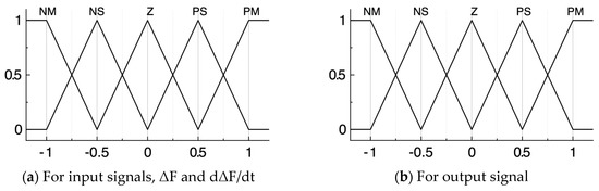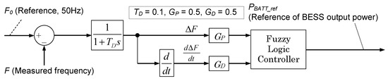 It is well known that a battery system can contribute well to suppressing power system frequency fluctuations. In this study, it is assumed that a battery energy storage system (BESS) is installed near the consumer and can be regulated so as to suppress frequency fluctuations in cooperation with the ASG. Though a lot of schemes have been proposed for BESS power control, fuzzy logic control is adopted in this study, as shown in Figure 10. The design concept of the battery controller is the same as that of the ASG. According to frequency deviation, output power reference is calculated based on the fuzzy control parameters shown in Figure 11 and Table 7. However, the control gain for the input signal and the membership function of the fuzzy control system in the BESS are different from those of DFIG and are tuned to behave cooperatively to further enhance the effectiveness of the control by DFIG. The fuzzy control contains differential operations in order to respond quickly to fast changes in the frequency. This scheme of control is basically the same as the control scheme of the ASG, but the roles of BESS and ASG are shared by the setting of different control gains, as mentioned above.