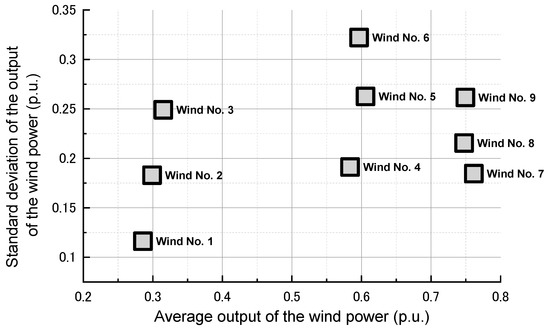 In order to evaluate the efficacy of the proposed approach to suppress the frequency fluctuations in a small-scale power system by the adjustable speed diesel engine-driven generator, system behavior under vacillating power from a wind power station in the power system was analyzed. Wind speed data, which was a measured record of the real wind in Hokkaido, Japan, was applied to the simulation analysis. This was because it was important to assess the performance of the proposed approach under a situation of natural wind conditions where the ability of the adjustable speed diesel engine-driven power plant to stabilize the power system frequency could be evaluated. Nine profiles of wind power obtained from the natural wind conditions were used in the simulation analysis (shown in Figure 12) and were referred to as Wind No.1 to 9. The wind speed data used in each profile was for 1 h, with a 1 s interval, and the resultant wind power had various different average levels and different vacillating levels corresponding to standard deviation (shown in Figure 12). Simulation analyses for four cases performed in this paper for the combination of two diesel generators are shown in Table 1. The rated capacity of the wind power station was set to 0.5 MW. This was based on the ideal range of controllable output of the ASG in Case 2 of Table 1. Though the rated output of the ASG in Case 2 was 2.5 MW, the actual output should have been within the range from 1.25 (50%) to 2.5 MW (100%) due to the limited range of the diesel engine output. In this situation, when the ASG output was 1.875 MW (75%), the center of the output range, then the ASG could provide ideal control, i.e., increase or decrease the output within ±0.625 MW (±25%). However, since the output correction (shown in Figure 9) was included in the control system, the ASG could hardly output the power near the upper limit (0.625 MW). Therefore, the rated output of the wind power station was set to 80% of 0.625 MW temporarily (thus, it was 0.5 MW). The power consumption of Load A and B were both 3.75 MW (75% of the power system capacity).