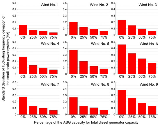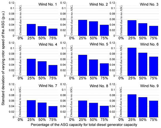 Figure 13 shows the calculated standard deviations of the fluctuating frequency of the power system in Case 1 to Case 4 under nine wind generator output profiles. The BESS assistance is not considered. It can be seen that the frequency fluctuation can effectively be reduced in the proposed method (Case 2 to Case 4) compared to the conventional case (Case 1). In the case of Winds No.6 and 9, frequency fluctuations are large, but when half of the power generation is supplied from the ASG, the fluctuations can be reduced to about half of that in Case 1. Figure 14 shows the standard deviation of the varying rotor speed of the ASG. It can be seen that the larger the power rating of the ASG, the smaller the rotor speed variation of the ASG.