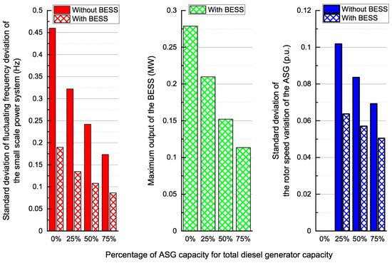 The effect of the BESS assisting the ASG control explained in Section 4 is evaluated in this section. The BESS controls its power to suppress the power system frequency fluctuation directly. Simulation results for the case of Wind No.6 are presented here because its fluctuation level is highest, as shown in Figure 12. The left part of Figure 15 shows the standard deviation of the power system frequency. As shown in Figure 15, power system frequency fluctuations can be suppressed more effectively than the case with only the ASG. Maximum battery power is also shown in the center part of Figure 15. Even when all of the diesel generators are conventional FS-SG, the BESS exhibits good performance. However, a larger BESS capacity will be needed. As the ASG capacity increases, the maximum output of the BESS decreases, and thus the power capacity of the BESS can be reduced. The right part of Figure 15 shows the standard deviation of the varying rotor speed of the ASG. It becomes smaller in the case where BESS is installed. It can also be said that the mechanical stress of the ASG can be reduced. Therefore, it can be concluded that the proposed combined control of the ASG and the BESS is very effective for stabilizing power system frequency fluctuations.