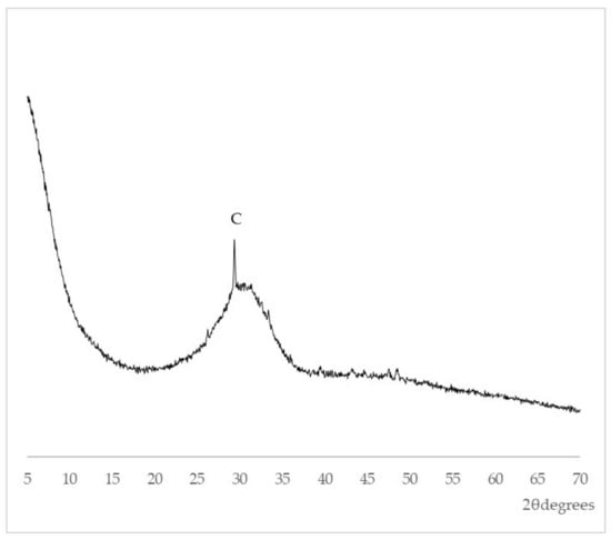 Brucker AXS D8 (Billerica, MA, USA) Advance equipment was employed to carry out X-ray diffraction (XRD) analyses. The range went from 5 to 70 2θ degrees using Cu Kα radiation at 20 mA and 40 kV, with a 2 s accumulation time and a 0.02 angle step. The XRD diffractogram of BFS is represented in Figure 2. The halo located within 20–35 2θ degrees was attributed to the amorphous phase of BFS. A crystalline phase attributed to the presence of calcite (C, CaCO3, PDF#050586) can also be observed.