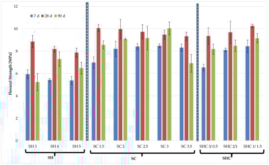 After analyzing the flexural strength results separately for the three studied mixtures, namely NaOH (SH series), Na2CO3 (SC series), and NaOH and Na2CO3 mixtures (SHC series), it highlights the following results: (a) for NaOH, an increase in Rf took place between 7 and 28 curing days. For the 90 days curing time, Rf decreased with increased activator molarity; (b) for Na2CO3 as an activator after 7 curing days, all the mortars had similar flexural strength values, except for the mortar with the lower quantity activator. After 28 curing days, all the values were similar, and strength slightly decreased in all the mortars after 90 curing days except for the mortar SC3; (c) when the NaOH and Na2CO3 mixture was used as the activator, the mortar with the lesser Na2CO3 quantity obtained the lower strength value at 7 curing days, but no significant difference among the three types of mortars was observed after 28 and 90 curing days. The flexural strengths after 28 curing days of the mortars were higher than after 90 curing days. The decreased flexural strength from 28 days to 90 days was attributed to the shrinkage cracks, in line with what Pacheco-Torgal et al. [] suggested. Many of the mortars with the three different activators reached a flexural strength between 8 and 10 MPa.