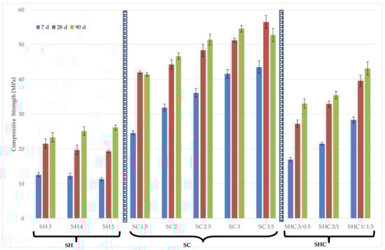 - When NaOH is used, for the studied molarities range, there was no global correlation between the molarity of the NaOH solution and the Rc for the three studied curing days. An increase in Rc was observed with curing time. For any mortar, the compressive strength at 90 days exceeded 30 MPa. Wang et al. [] reported for NaOH that variation in the quantity of NaOH within 3–11% of the range (per slag weight) had very little effect on strength. In the present study, the NaOH percentages varied between 4.8% (SH3) and 8% (SH5). For the wider variations in the NaOH concentration, other authors obtained significant differences in compressive strength. For example, de Mores Pinheiro et al. [] made mortars with BFS activated with NaOH and KOH: for the NaOH-activated mortars, those activated with 4 M of NaOH (6.4% per slag weight) at 65 °C for 7 days obtained a compressive strength of 17.47 MPa compared to 31.11 MPa obtained by the mortar activated with 12 M of NaOH (19.2% per slag weight).