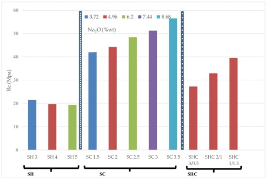 - When the NaOH and Na2CO3 mixtures were used as activating reagents, Rc was enhanced when the quantity of Na2CO3 in the mixture was increased. Although all the mortars of SHC the series had the same quantity of Na2O in relation to BFS weight, the best results were obtained for the mortars with the largest quantity of Na2CO3 (SHC 1/1.5). Collins and Sanjayan [] demonstrated the benefits of using Na2CO3 in combination with NaOH, but we observed that the NaOH/Na2CO3 mixture was much less efficient in terms of compressive strength development. In all cases, Rc was lower than the values obtained in the series with only Na2CO3.
