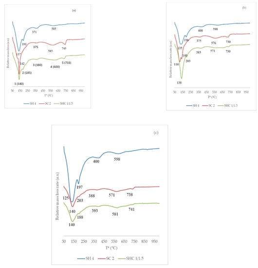 As shown in Figure 7, peaks 1, 2 and 3 appeared at practically all the curing time and for all the activators, but with different heights and width peaks. Peaks 4 and 5 were more visible for series SC and SHC that contained Na2CO3 as an activator. The pastes with CO3−2 ions produce compounds of type carboaluminate (C3A.CaCO3.12H2O) []. The partial and total mass losses for all the studied pastes are summarized in Table 3 for the different curing ages. The mass loss in the interval 50–300 °C presented a great evolution between 7 and 28 curing days; these data confirm that the most developed products within this time interval are CSH and CASH gel.