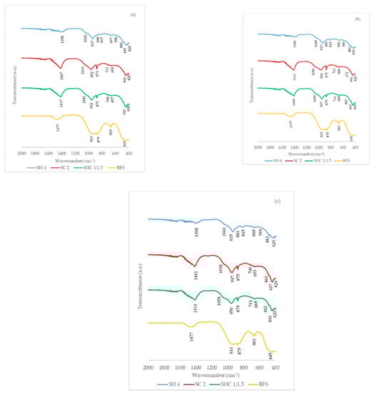 The unreacted BFS presented various peaks: (a) at around 1477 cm−1, the peak was identified as the asymmetric stretching mode of O-C-O in CO3−2 due to the presence of calcite; (b) the broadband centered at 933 cm−1 corresponded to the asymmetric stretching vibration mode of Si-O-T (T: Si or Al); (c) the shoulder at 875 cm−1 was attributed to the asymmetric stretching of the AlO4 groups; (d) the peak at 663 cm−1 corresponded to vibration modes of sulfate, (e) finally at around 445 cm−1 the band assigned to the Si-O-Si bending vibrations appeared.