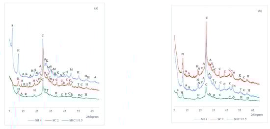 The pastes cured for 28 and 90 days were analyzed by XRD. Figure 9 shows the XRD diffractograms of SH4, SC2 and SHC1/1.5 for both these curing ages. Table 5 represents the abbreviation for the crystalline phases found in XRD, their PDF card number and the pastes that presented this phase.