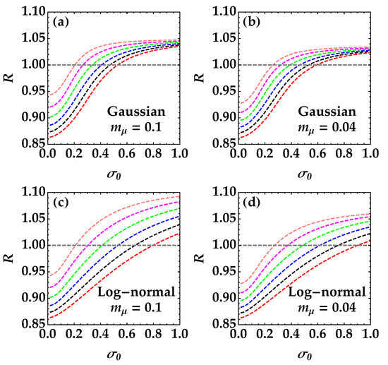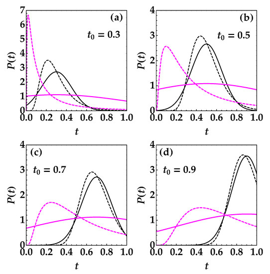 In order to appreciate the differences between the two distributions, in Figure 2 we show some examples. We observe that, in general, at increasing the standard deviation, the discrepancies between Gaussian and log-normal distributions become more evident, since the log-normal distribution gets more asymmetric, while the Gaussian one remains symmetric. Moreover, comparing the two distributions for a given choice of standard deviation and mean value shows that for small mean values of (see panels (a) and (b)) and large values of (see magenta curves) the log-normal distribution is confined in the region corresponding to small values of t (dashed line), while the Gaussian one is uniformly distributed all over the range (0,1) (solid line). On the contrary, for large mean values of (see panels (c) and (d)) and large values of (see magenta curves) the Gaussian distribution has a longer tail towards small values of t than the log-normal one. At variance with these conditions, in all panels for small values of (see black curves) the two distributions are more confined and more similar.