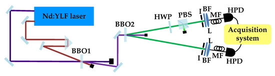 A sketch of the employed experimental setup in shown in Figure 3. The fundamental (at 1047 nm) and the third harmonic (at 349 nm) of a Nd:YLF laser (IC-500, High Q Laser, Rankweil, Austria and 2003) regeneratively amplified at 500 Hz are sent to a barium-borate crystal (BBO1, cut angle = 37, 8-mm long) in order to produce the fourth-harmonic (at 262 nm) field by noncollinear sum-frequency generation. The generated beam is used to pump spontaneous parametric downconversion in a second BBO (BBO2, cut angle = 46.7, 6-mm long) crystal.