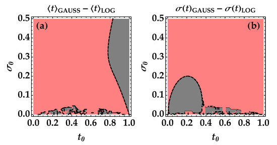 At variance with Ref. [17], in which we focused our attention on the possibility of keeping observing nonclassicality in the presence of an asymmetric loss between the two parties of the twin-beam states, here we aim at finding the limits imposed by the parameters that describe the transmittance statistics, both for the Gaussian and the log-normal distributions. According to Equation (4), the noise reduction factor is a function of the first two moments of the distribution of t, independent of the considered distribution. This means that by choosing the same mean value and the same standard deviation , the Gaussian and the log-normal distributions act in the same way. On the contrary, if we consider the values of and over the entire domains, we expect different results. To better emphasize this point, in panel (a) of Figure 4 we show, as contour plot, the difference between the mean value of the normalized Gaussian distribution and that of the normalized log-normal distribution as a function of and , while in panel (b) of Figure 4 we do the same for the standard deviation , namely we plot the difference . In panel (a) (panel (b)), the pink region corresponds to values of () larger than 0, the gray region to values lower than 0, and the black-dashed line dividing the pink region from the gray one corresponds to the condition (panel (a)), and to the condition (panel (b)). As it can be noticed by comparing the two panels, it is not possible to find a set of and values corresponding to equal values of and for the two distributions, unless one considers sparse choices of and for .