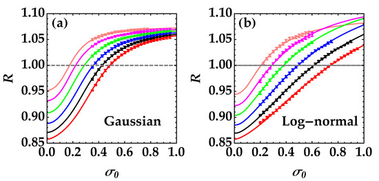 The curves shown in panels (a) and (b) are for Gaussian distributions, while those in panels (c) and (d) are for log-normal distributions. In general, the plots resemble the experimental behavior of the plots in Figure 5. However, we notice that depending on the choice of , the value of at which the noise reduction factor is equal to 1, namely the boundary between classical and nonclassical correlations, changes. In particular, the lower the value of , the larger the threshold value of . Indeed, according to Equation (4), the lower the value of , the lower the value of R. To better investigate this result, in Figure 7 we plot the values of at which, for fixed choices of and and for 4 possible choices of , the theoretical value of R is equal to 1 as a function of . We show the results in the case of Gaussian distributions in panel (a) and those for log-normal distributions in panel (b). In general, we can see that the threshold values of increase at increasing values of with different slopes for the two distributions. Moreover, for log-normal distributions of t the growth is more rapid than for Gaussian distributions.