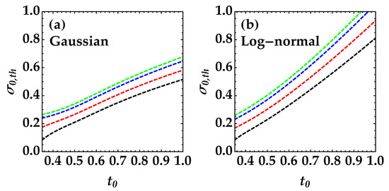 Expected threshold value of obtained by setting in Equation (4) for and . The data are shown as a function of for different choices of : 0.2 (black curve), 0.1 (red curve), 0.04 (blue curve) and 0.02 (green curve). Panel (a) corresponds to the case of Gaussian distributions of , while panel (b) to the case of log-normal distributions.
