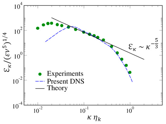 As an illustration, Figure 1 shows the non-dimensional three-dimensional (3D) energy spectrum obtained in the present DNS. For comparison, the experimental results of Comte-Bellot and Corrsin [41] and the Kolmogorov spectrum are also presented.