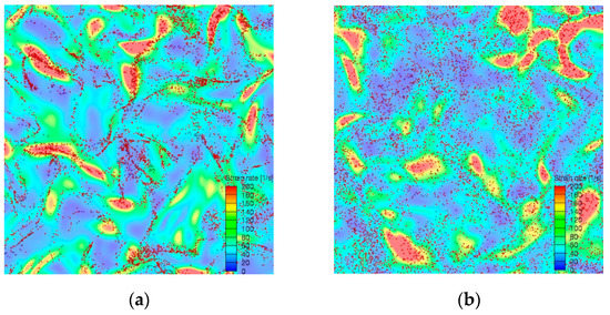 As an illustration, Figure 2 shows typical snapshots of a two-dimensional slice of particle distribution in the turbulent flow field depending on their inertia. Following Reference [39], particles tend to form distinct patterns in the flow, which depend on its inertia. For instance, for the case of , Figure 2a presents the case of , where well-differentiated narrow particle ropes can be observed in the background coloured by fluid strain rate (average strain rate in this configuration is 61 s−1). As it is clearly noticed, particles tend to preferentially sample zones with a higher than mean fluid strain rate (green to red colours), and also, although not shown, lower than mean fluid vorticity—a view that agrees with the previous literature. Figure 2b shows, on the other hand, the distribution of particles with ; here, no distinct clusters can be appreciated, and particles tend to be spread much more evenly than in Figure 2a, although some voids are noticed. As commented before, the reason for such distribution patterns lies in the particle–turbulence interaction: for intermediate particle inertia, , the centrifuging effect of particles towards the rim of vortical structures as well as the sling effect impulse them to show preferential concentration; on the other side, large inertia particles are only marginally affected by its interaction with turbulent vortices and tend to describe straight trajectories (the so-called inertia filtering effect), which are only modified by collisions, resulting in a much more uniform distribution along the fluid field.