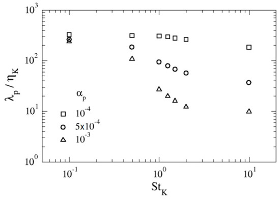 From Figure 12, it can be clearly seen that the values obtained from LBM-based DNS agree reasonably well with the correlation Equation (8). Therefore, the theoretical model of Zaichik and Alipchenkov is adequate for describing the Eulerian velocity correlation between neighbouring particles, as it could be expected. Moreover, the DNS results for different solid volume fractions show nearly no scattering of values for all the range of studied Stokes numbers.