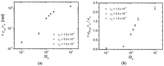The importance of collisional effects on the turbulence-induced particle transport can be illustrated by plotting the behaviour of the particle Lagrangian integral time scale, , versus particle inertia. is computed as the integral of the particle Lagrangian autocorrelation function and it measures the time scale in which particle velocities are correlated in time along their trajectories [38]. Figure 6a shows the curves of the quotient depending on particle Stokes number, for the three considered values of . A decreasing trend with increasing is observed, which is due to the growing of the time scale with particle inertia, reflecting the fact that more inertial particles are less affected by turbulent fluctuations and that the particle motion becomes more correlated. As a consequence, large inertia particles tend to experience a ballistic motion between consecutive collisions. Regarding the effect of particle volume fraction on , it is found that the increase in the number of collisions has only a marginal effect on the particle Lagrangian autocorrelation timescale, where, nevertheless, a small decrease of this quantity can be observed with increasing (i.e., increase in ), as expected. This means that the particle motion becomes slightly more decorrelated as a consequence of the increasing collision rate and the resulting faster change of particle velocity.
