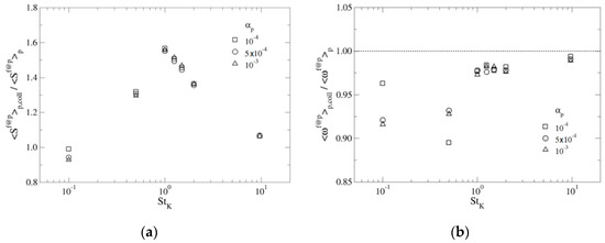 Figure 9b presents the ratio between the fluid vorticity at particle collision locations, averaged for all collisional events, , and the fluid vorticity at particle positions, averaged for all particles, . As it was said previously, particles tend to sample fluid locations with lower than mean vorticity. In our simulations, this behaviour also happens for the smallest inertia particles, , which otherwise approach the tracers’ behaviour. They are located in areas with lower than mean fluid vorticity, as already noted in Reference [22]. Looking at the locations where inter-particle collisions happen, , it is found that such locations are characterised by smaller values than (see Figure 9b). This observation is valid for all the Stokes numbers, although for particles with , the two values are very close. This fact is parallel to the tendency of particle collisions to occur in areas with fluid strain rate higher than the mean value computed at particle positions, , and, therefore, could be somehow expected. However, this last observation is contrary to that presented in Reference [22], where the fluid enstrophy sampled at collision locations was higher than the average value sampled at particle positions. At the moment, the reason for such discrepancy is not clear.