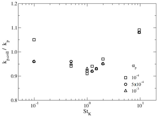 Regarding the dependence of the simulated non-dimensional collision kernel with particle volume fraction, Figure 11 shows that it does not have an appreciable effect: only a marginal increase of is observed with growing .